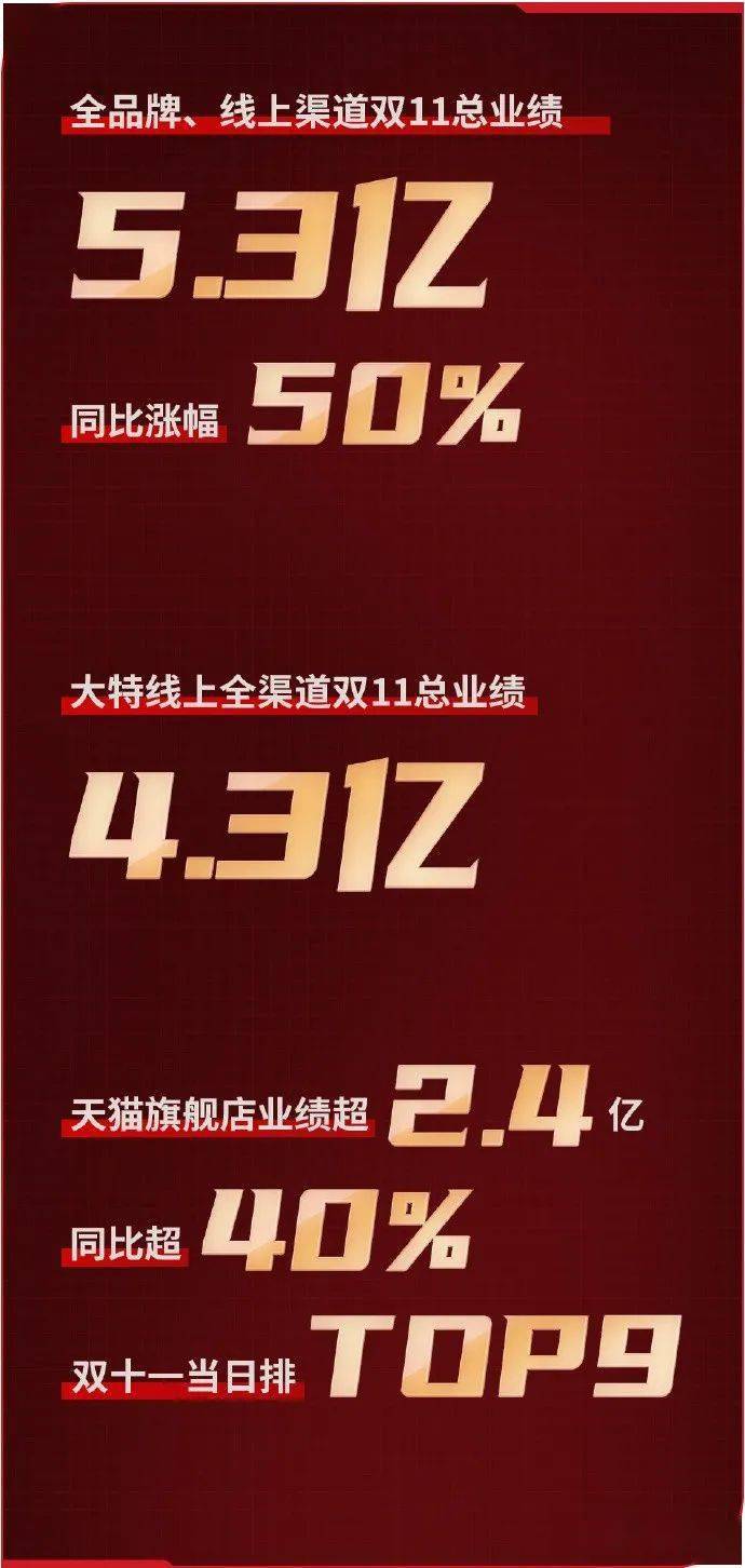 11月12日消息,特步公布了双11成绩单:旗舰店成交额2.4亿元,同比增长40%,特步电商成交额超过4亿元,特步极端电商成交额超过5亿,件单价提升10%,尖货占比提升300%,“Z世代”占比超53%,会员增长62%。