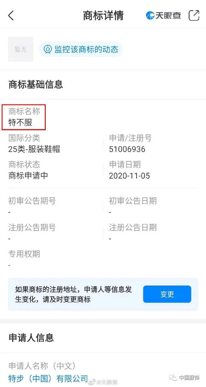 近日,天眼查数据显示,特步(中国)有限公司新增商标申请信息,商标名称为“特不服”,商标分类为皮革皮具,商标状态为注册申请中。资料显示,特步(中国))有限公司成立于2002年2月,法定代表人为丁水波,注册资本约7.6亿元,该公司由特步集团有限公司全资持股。