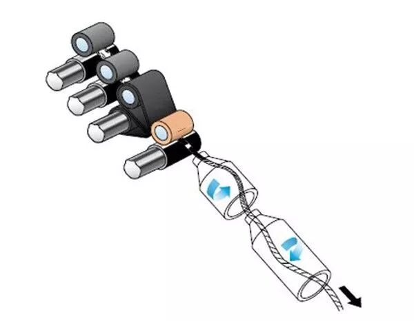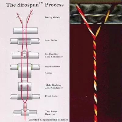 a、由于在加捻前,纱条中单纤维充分伸直,相互平行,而且排列紧密,所以在加捻罗拉钳口处(也叫阻捻罗拉,因为其有阻止捻度传递的作用),纱条直径变得很小,所以基本消除了“加捻三角区”,由于加捻前单纤维充分伸直、平行,没有毛羽伸出纱条主体,所以成纱毛羽很少,特别是3毫米以上毛羽极少。