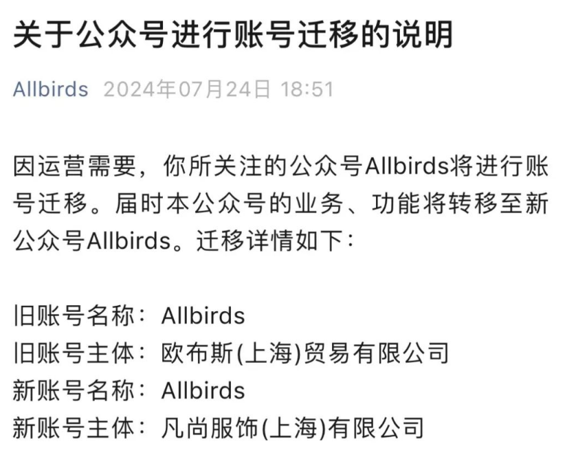 另外,7月24日,美国运动鞋履品牌Allbirds微信公众号发布账号迁移通知,称账号主体由欧布斯(上海)贸易有限公司迁移至凡尚服饰(上海)有限公司。 凡尚服饰(上海)有限公司成立于2016年,是 百丽时尚集团 全资附属公司。