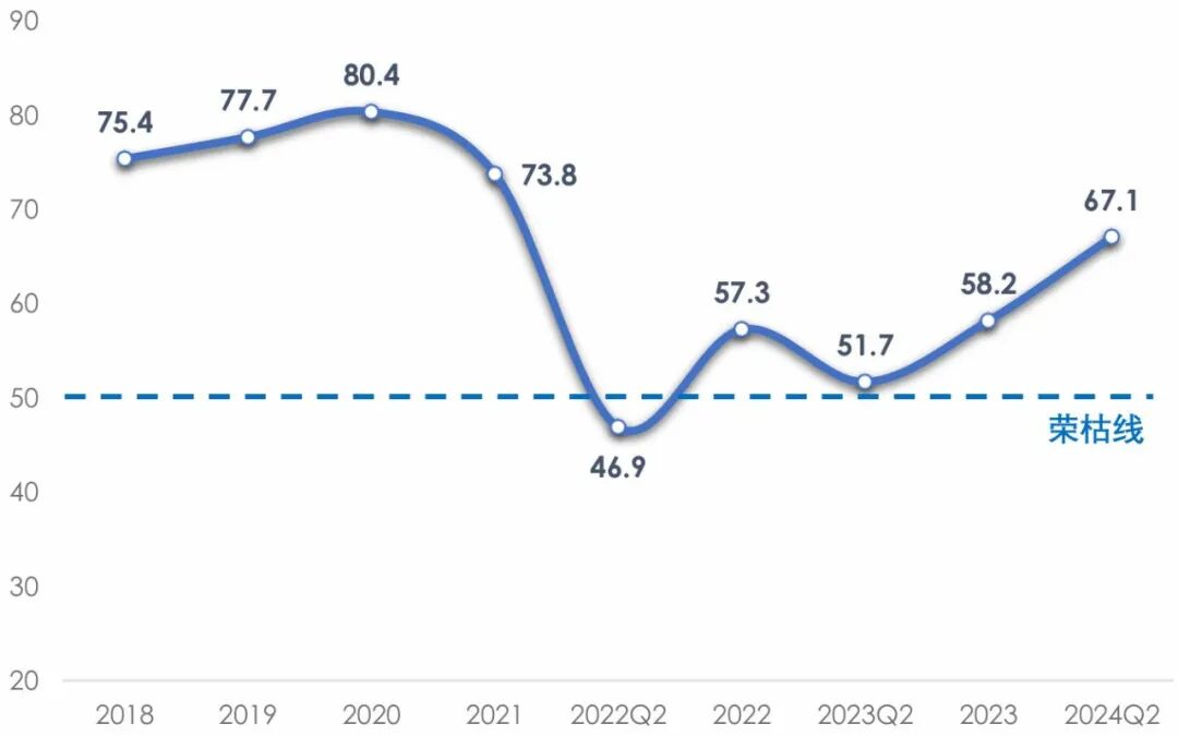 2024年上半年,外部环境复杂性严峻性不确定性明显上升、国内结构调整持续深化等带来新挑战,但宏观政策效应持续释放、外需有所回暖、新质生产力加速发展等因素也形成新支撑。我国产业用纺织品行业的市场需求总体回暖,新冠肺炎疫情带来的需求大幅波动的影响已经基本消退,行业工业增加值增速自2023年年初以来重回上升通道,但部分应用领域需求的不确定性和各类潜在风险影响着行业当前的发展和对未来的预期。根据协会调研,2024年上半年我国产业用纺织品行业景气指数为67.1,较2023年同期(51.7)显著回升(图1)。
