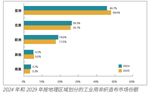 2024 年,亚洲将成为全球最大的工业用非织造布消费市场,市场份额为45.7%,北美(26.3%)和欧洲(19%)分列第二和第三位。到2029年,这一领先地位不会改变,北美、欧洲和南美的市场份额将逐渐被亚洲取代。