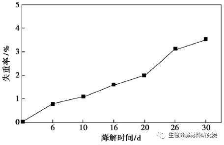 从上图可以得知,在自然土壤环境中,未改性PBS有较好的生物降解性能。随着自然降解时间的增加,降解率逐渐提高,降解率在30d的时候已经达到3.5%,表现出优异的生物降解性能,完全可以满足生产生活实际应用需要。