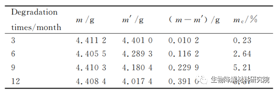 由上表可见,随着降解时间的增加,BF/PLA可生物降解复合材料的质量损失率均逐渐增大。降解3个月后BF/PLA复合材料质量损失率为0.23%,降解时间12个月时,复合材料质量损失率达到了8.87%