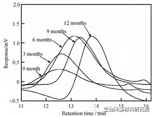 由上图可见,随着降解时间增加,BF/PLA材料中PLA的GPC峰型逐渐变窄,出峰时间逐渐延迟。试样埋入土壤中后首先吸水水解酯键断裂,PLA分子骨架部分破裂,使PLA平均分子量降低,分子量分布变窄,GPC曲线出峰时间延迟