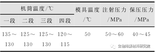 按照下表所示的工艺条件,在双螺杆挤出机中进行熔融共混、挤出造粒,随后用鼓风干燥箱烘干;按照表中所示的注塑工艺条件,在精密注塑机中注射成标准试样,用于下一步的性能测试。