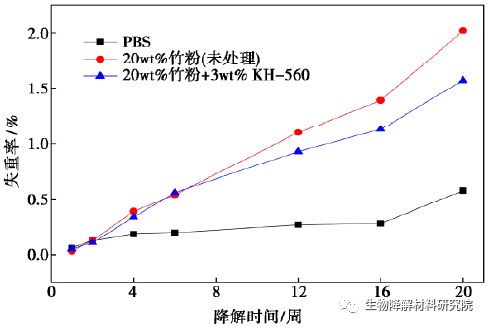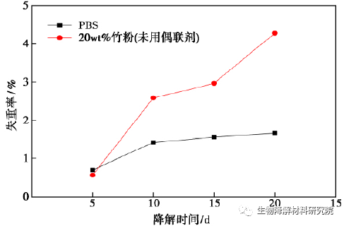 利用竹粉或淀粉进行共混改性有利于增加PBS的生物降解率。除使用偶联剂的 PBS/竹粉复合材料之外,PBS/竹粉复合材料比未改性PBS降解率显著提高
