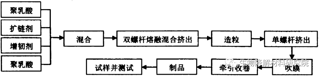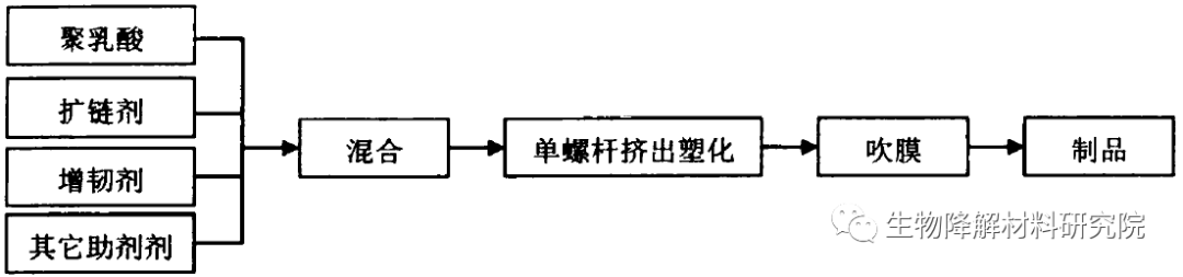 先将PLA干燥,然后将PLA树脂、扩链剂和増韧剂等混合均匀,直接加入到单螺杆挤出机中完成熔融和混合,并由机头口模挤出吹塑成膜。这样缩短了生产周期,节约了生产成本。