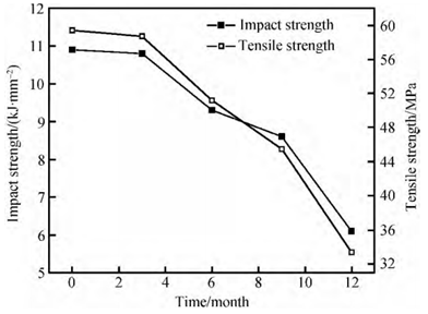 由上图可见,随着降解时间的增加BF/PLA材料的冲击强度和拉伸强度均逐渐降低。但前3个月,冲击强度和拉伸强度下降均很少;12月后大幅降低。