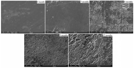 随着降解时间的增加,复合材料表面逐渐变得粗糙。降解6个月后,复合材料表面出现了浅沟槽,小分子物质被微生物进一步分解为CO2和H2O