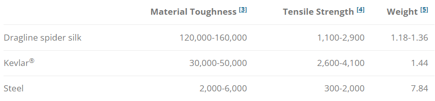 Kraig设想,基因工程蜘蛛丝具有优越的机械特性,将超越当前一代的高性能纤维。我们相信,蜘蛛丝在某些方面优于目前市场上可用的材料,因此随着蜘蛛丝的商业推出,需求和市场机会将扩大。例如,天然蜘蛛丝能够吸收超过 100,000 焦耳的动能,使其成为结构防爆的潜在理想材料。下表说明了蜘蛛丝令人难以置信的韧性和强度重量比。