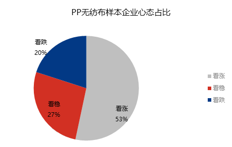 对中国PP无纺布市场参与者10月心态调研的结果显示,53%的企业看涨,27%的企业看稳,20%的企业看跌。看涨者心态认为宏观多重利好政策落地,刺激消费。看跌者心态:终端需求一般,旺季氛围不明显。看稳者心态为,供需矛盾持续,短期或持稳。