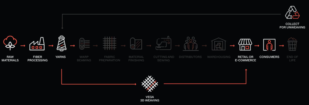 unspun是一家成立于美国的时尚科技B-corp,其使命是将全球人类碳排放量减少1%。为了实现这一目标,它正在建立实现零浪费和循环生产所需的工具——一个没有任何东西变成垃圾的未来。其发明Vega是世界上第一项用于服装的3D编织技术。Vega可在几分钟内用纱线织出衣服。它将时尚供应链简化为一个垂直的运作,而不考虑地点。这种专有的3D编织和数字合身技术是制作梭织服装的最快、最干净、最具成本竞争力的方式。Vega在微工厂环境中实现可扩展生产,实现本地、自动化和按需制造。unspun与品牌和制造商合作,致力于通过自动化、本地化和低影响的生产来简化时尚供应链并降低其碳排放。