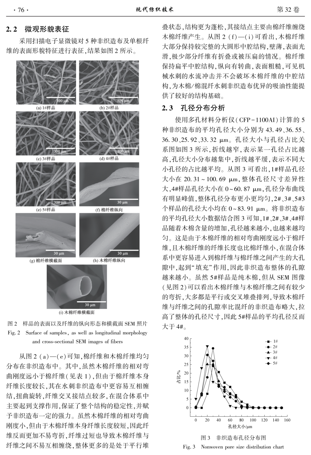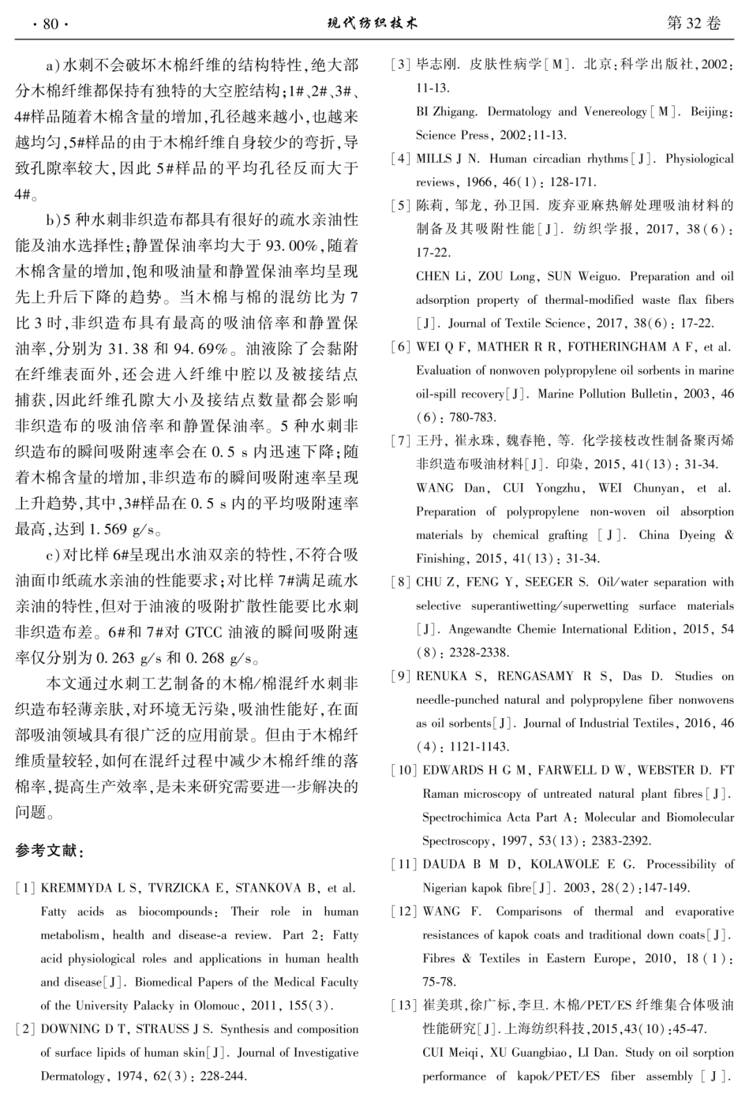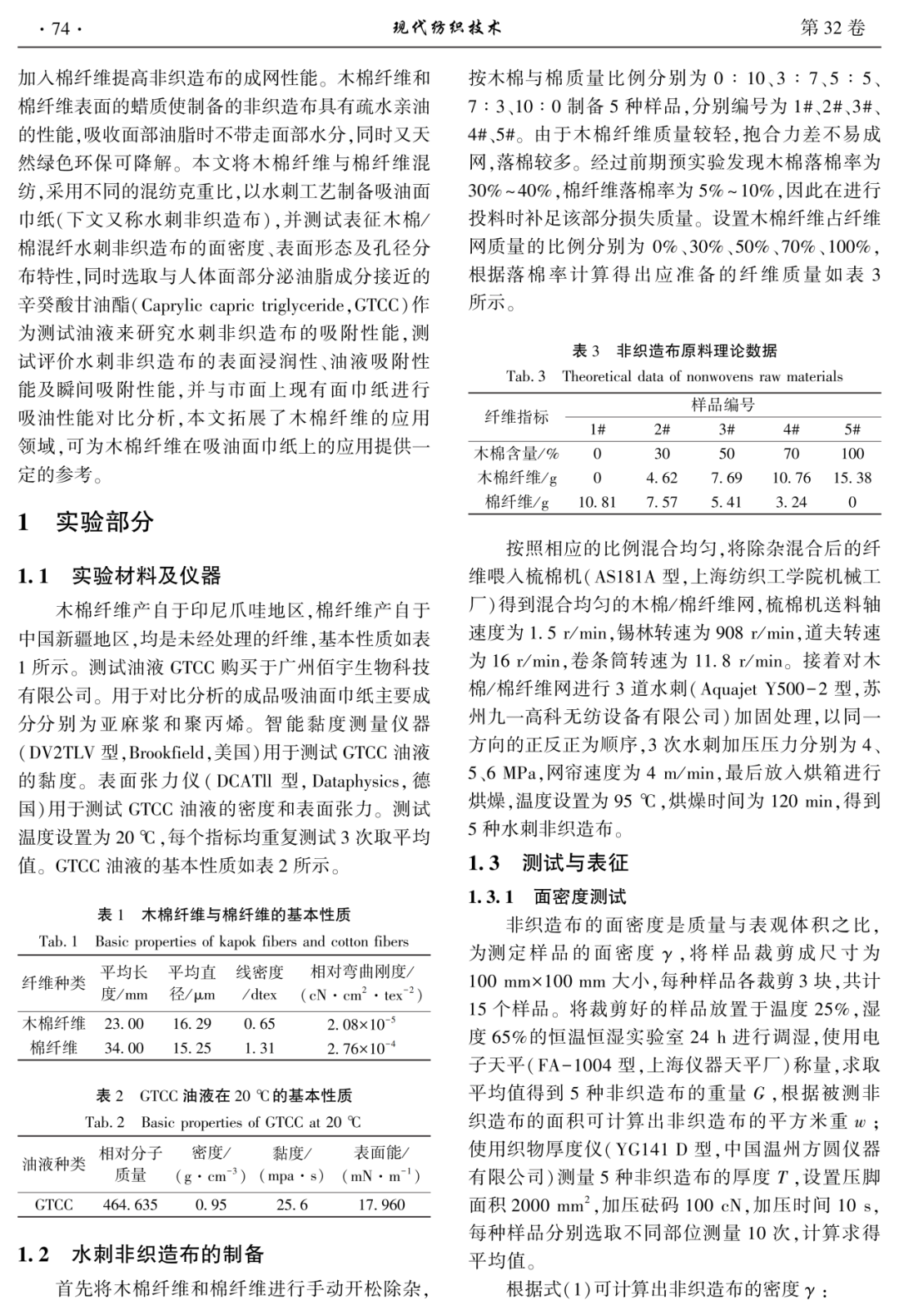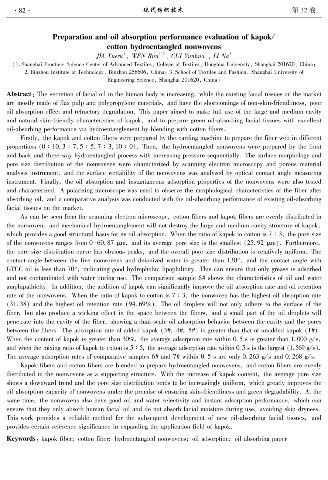 现代纺织技术 | 温润团队 | 木棉/棉水刺非织造布的制备及吸油性能评价