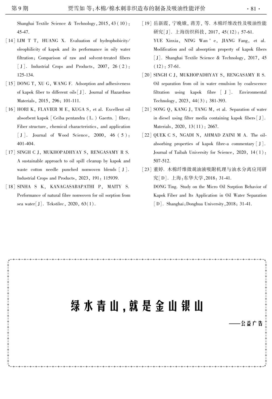 关键词:木棉纤维;棉纤维;水刺非织造布;油液吸附;吸油纸