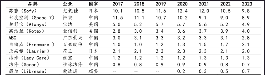 在中国,卫生巾等女性经期护理产品是舶来品,我国卫生巾行业发展始于20世纪80年代。初期,宝洁、尤妮佳、金佰利等外资厂商进入,凭借产品质量、品牌、技术等优势,占据主要市场份额。由丝宝集团于1997年创立的洁婷,应该算是初代国货卫生巾品牌。研究机构的数据显示,2017年-2023年,洁婷在中国卫生巾行业的市场占有率维持在1.2%-1.3%,在所有品牌中排名第八。目前,丝宝护理拥有“洁婷”、“全因爱”、“美月见”等品牌,其推出的夜用卫生巾、迷你巾、运动型等系列产品,不仅满足了消费者多样化的需求,还引领了行业的潮流。