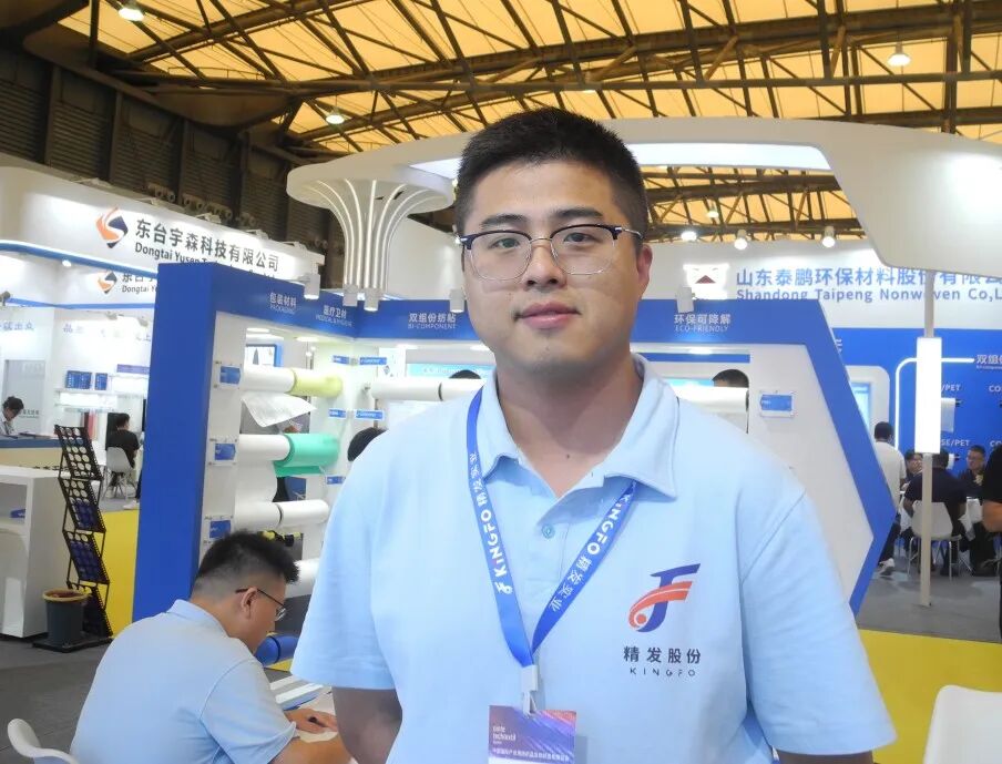 山东泰鹏环保材料股份有限公司隶属于泰鹏集团,是一家专业从事非织造材料产品的研发、生产及销售的高新技术企业,他们的产品广泛应用于空气过滤、水过滤、食品包装、汽车内饰等领域。该公司副总经理宋冠军先生介绍道,此次他们参展的亮点之一是双组分无纺布,包括PET/CoPET、PE/PET、PA6/PET、PLA/CoPLA等产品。