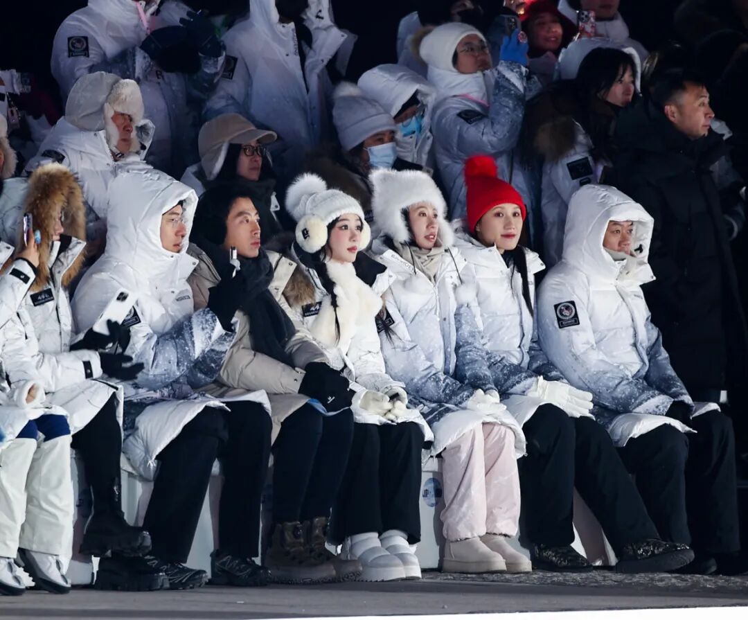 观秀嘉宾从右至左:冰雪奥运冠军赵宏博、张虹、申雪,波司登品牌代言人杨紫,波司登品牌大使、南极大使王昱珩等