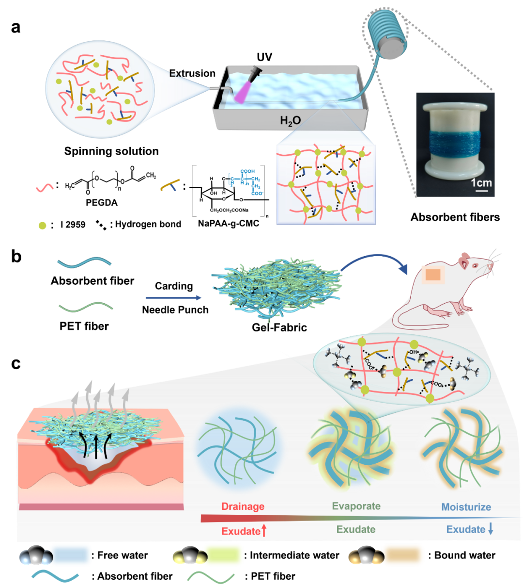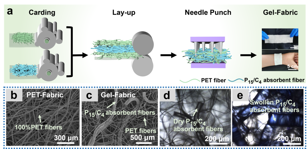 期, 东华大学朱美芳/侯恺研究团队 构建了一种新型的水凝胶非织造布(Gel-Fabric)作为敷料的吸收层(图1)。它具有不对称的两亲性表面和持久的微观多孔结构,可有效地动态调节伤口表面的水分,同时具有优异的吸湿、渗透和保湿性能。水凝胶非织造布可以在愈合前期吸收多余的渗出物并促进蒸发,然后在愈合后期保持伤口的水分环境。这是一种 无需更换敷料,全程一步治疗高渗液伤口的新方法,具有重要的临床意义。