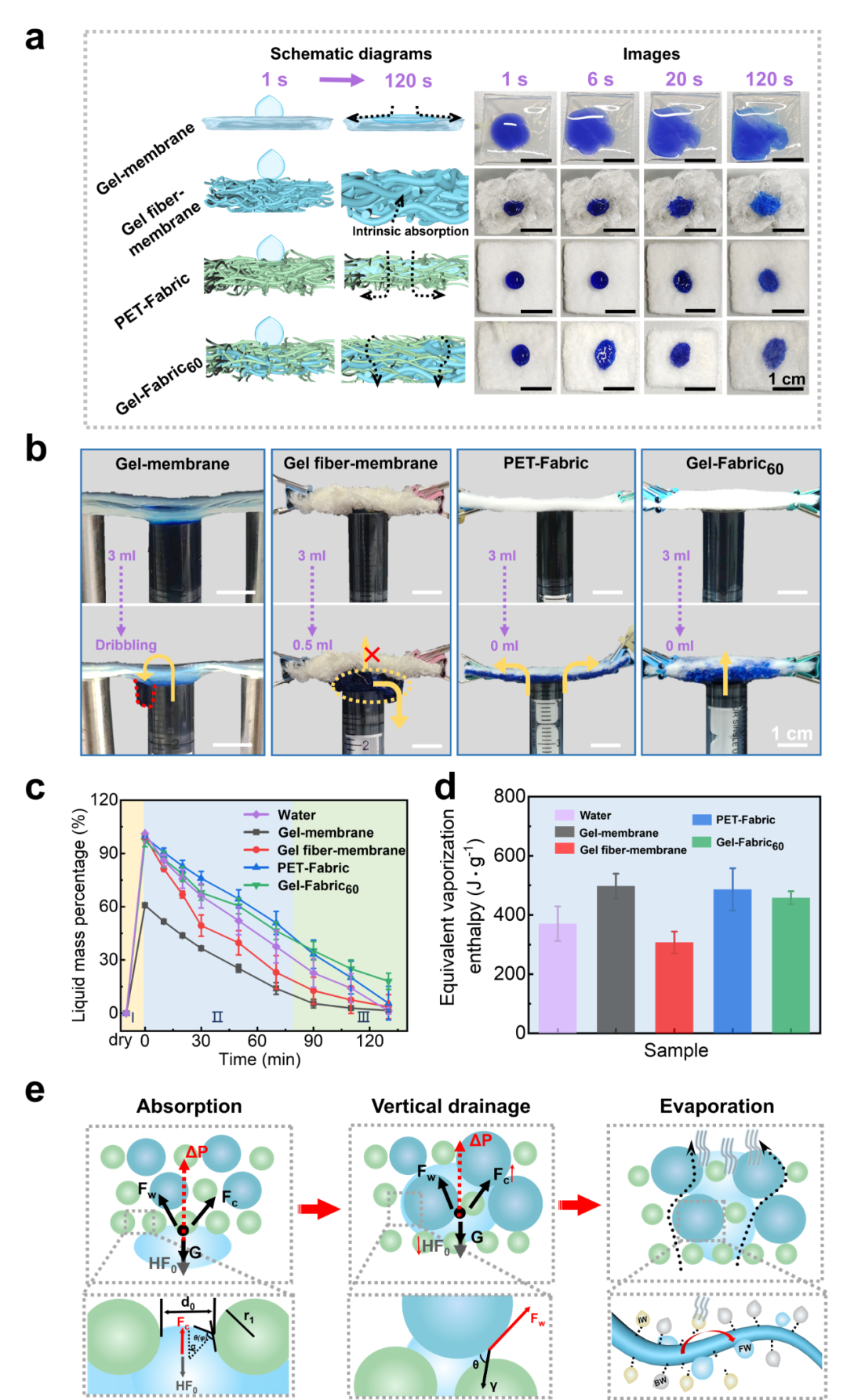 本研究通过整合亲水性本征吸水纤维和疏水性超细PET纤维,构建了具有非对称两亲性表面和持久微观多孔结构的水凝胶非织造布(图 2)。本征吸水纤维的强亲水性削弱了孔间毛细力,从而降低了自由水的垂直泵送能力,导致液滴积聚。因此,我们利用疏水超细PET纤维构建微孔结构,可以产生较强的毛细效应。同时,将PET纤维与吸水纤维混合,使材料的亲疏水性协调一致,产生Young-Laplace压力,促进自由水的显著渗透和输运。