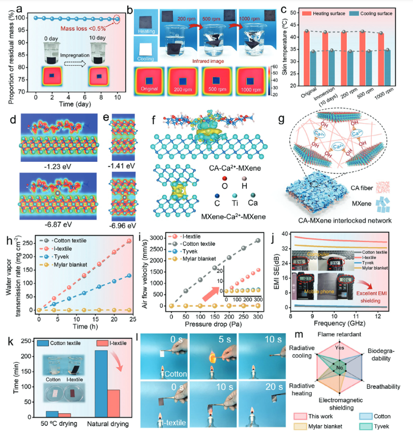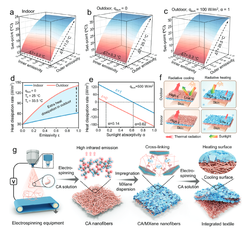 日前,北京林业大学许凤教授、陈胜副教授团队以人体传热模型为指导,开发了一种集成辐射加热和冷却的多功能热管理织物。该织物由MXene层和醋酸纤维素(CA)层通过静电纺丝的方式复合,具有非对称的光谱特征。织物的MXene层朝外时实现加热保暖,CA层朝外时实现人体降温。因此,在室内(12.6 ℃)和室外(19.6 ℃)大温差条件下,穿着该织物的皮肤温度变化幅度分别比穿着棉织物的皮肤低7.3和6.8 ℃。此外,该织物还具有优异的可穿戴性(透气性和耐洗涤性)、可回收性和生物降解性。模拟计算表明,如果在全国推广该织物,可节省约30%的建筑供暖和制冷能源。