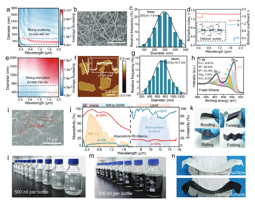 利用Mie理论计算了CA纳米纤维和MXene纳米片在太阳光谱上的散射效率与直径的函数关系,得出纤维直径分布在200-400 nm范围内的纳米纤维能有效地散射太阳光。MXene纳米片边长分布在400-750 nm范围内能有效地吸收太阳光。该织物还具有良好的柔韧性,可规模化制备。