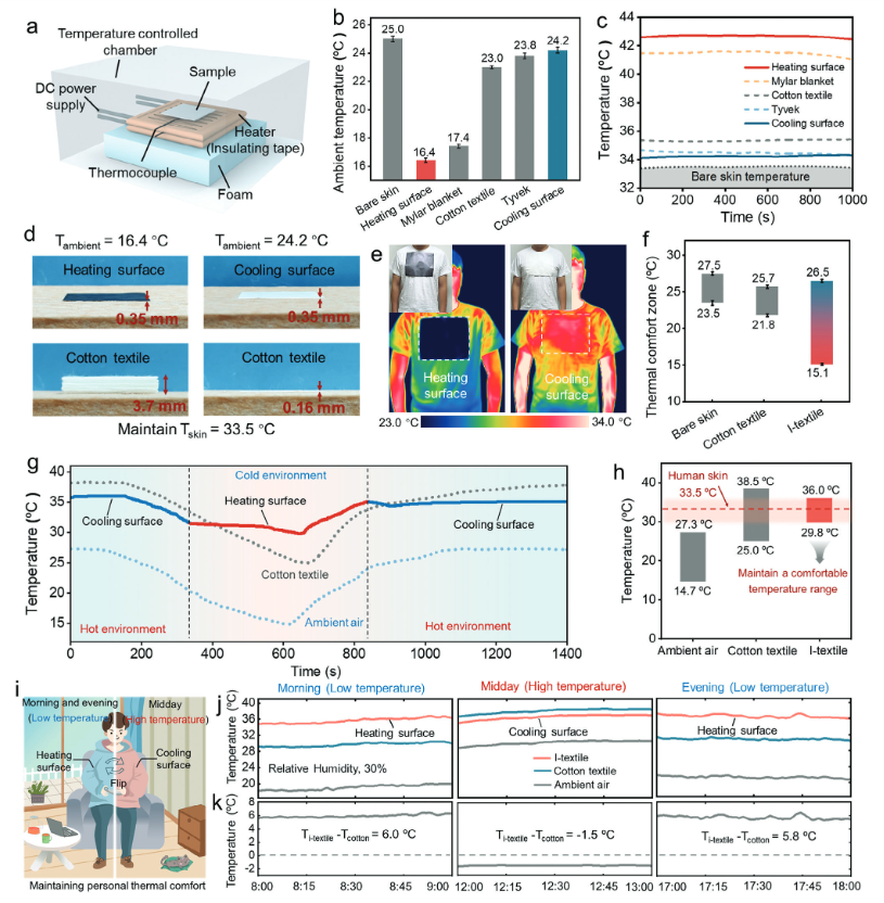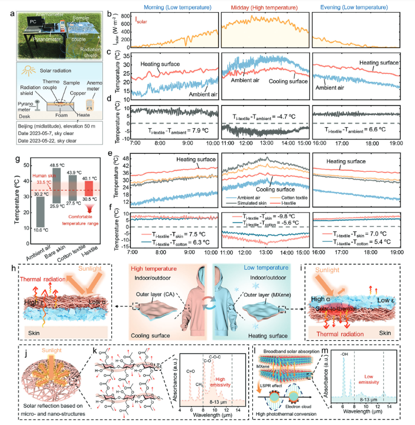 MXene层具有较高的太阳光吸收率(89%)和低的中红外发射率(14%),CA层具有较低的太阳吸收率(4%)和较高的中红外发射率(88%)。因此,当MXene层朝外时,织物实现了加热,CA层朝外时,织物实现了冷却。即使室内和室外的温度变化幅度分别达到12.6和19.6 ℃,织物显著减小了皮肤温度的变化范围(比在室内和室外穿着传统棉织物低7.3和6.8 ℃)。