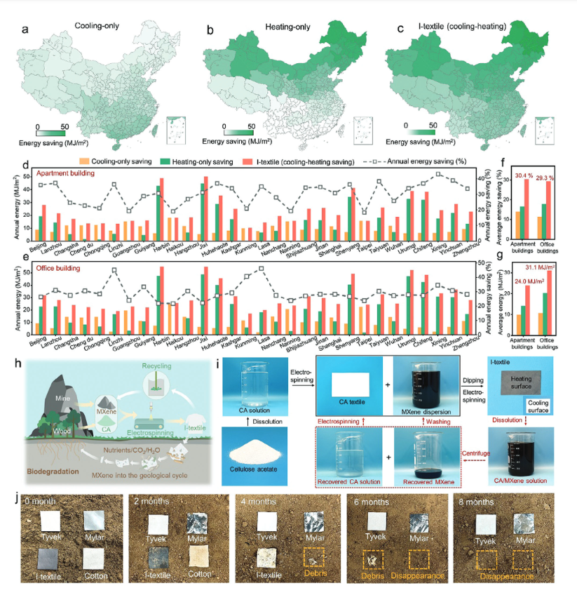 建筑能耗模拟表明,如果该织物被居民穿着并在中国推广使用,可节省约30%的建筑采暖和制冷能源。织物也可以在闭环回收过程中实现回收再利用,在土壤中8个月可被完全降解,相较于市售纺织品环境负担更低。