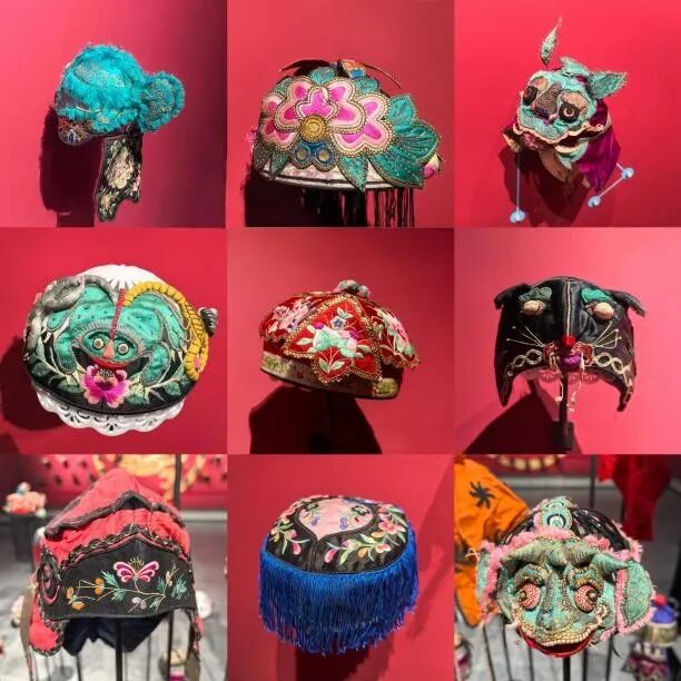 活动现场展出了近300顶清代、民国时期的虎头帽:有红的、绿的、蓝的、黑的,色彩纷繁;有无顶的帽圈,镂空的凉帽,春秋季佩戴的碗帽,冬季保暖的风帽,款式各异;有老虎、狮子、麒麟、蝙蝠、龙、凤、“十二生肖”等动物造型,莲花、佛手、桃子、梅花、松树、竹子等植物造型,形象逼真。刺绣五毒图案寓意驱邪祛祟、百毒不侵,莲花和童子寓意连生贵子、家族昌盛,莲花、佛手、桃子的三多纹样寓意加官进爵、福寿双全,底蕴深厚。一顶童帽,就是一个愿望,一份期许,一个祝福。这些来自一二百年前的文物,为我们打开了了解中国非遗工艺、了解中华优秀传统文化的窗户。
