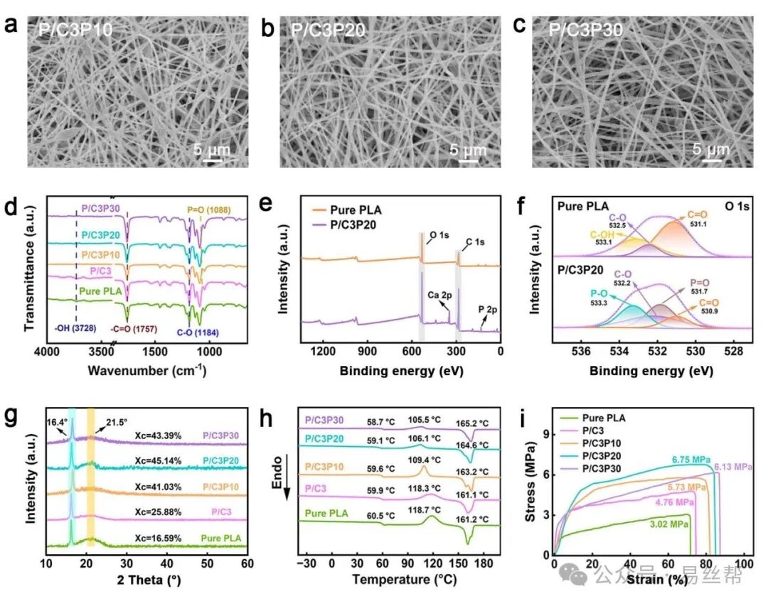 改性后的聚乳酸基阻燃摩擦电材料纤维表面均匀平滑,纤维平均直径增大。FTIR中C=O和P=O的红移表明双层氢键的存在;XRD分析表明核壳纤维膜的结晶度得到明显提升;XPS中出现了P的结合能峰,并且P-O和C=O的偏移共同印证氢键的存在。DSC中熔融峰由双峰转变为单峰,表明β相向更耐热的α相转变。另外,由于核壳结构的增强效应,拉伸强度和断裂伸长率得到有效提升。