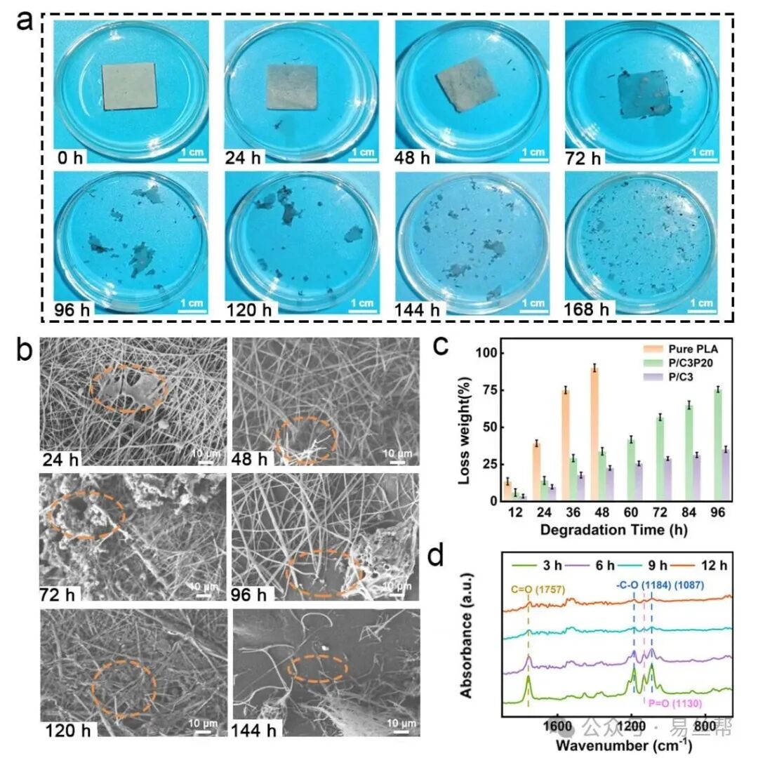 蛋白酶K溶液酶解实验表明,PLA纤维降解过程先粘结断裂,随后出现团簇,最后溶解消失。该材料具有优异的可生物降解性,在第4天降解超过70%。随降解时间的增加,C=O吸光度降低,表明PLA的酯基水解断键,形成乳酸小分子,表明该材料对环境友好、无污染。
