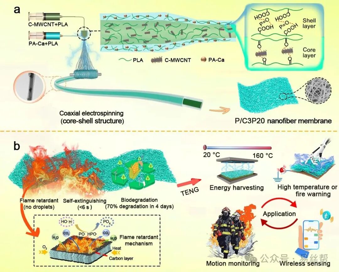 研究人员通过同轴静电纺丝法制备了核层结构的阻燃摩擦电材料。壳层中的PA-Ca与PLA形成P=O···H氢键交联,核层中的C-MWCNT与PLA形成C=O···H氢键交联。双层氢键交联网络增强了纳米纤维膜的结构稳定性,同时促进了PA-Ca和C-MWCNT在壳层和核层中的分散性,避免了PA-Ca和C-MWCNT氢键交联引起的团聚现象,同时增强了核壳纤维膜的阻燃性和摩擦电性。该阻燃PLA基摩擦电材料对高温火灾环境下的运动感知、高温和火灾报警具有重要意义。