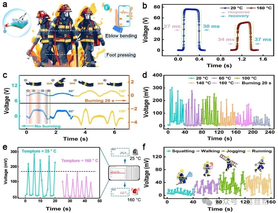 在智能化浪潮推动下,便携式可穿戴设备正加速迭代升级,但其中能源供应系统在高温及明火场景中易失效的问题日益凸显。基于接触起电与静电感应协同作用的摩擦纳米发电机(TENG)在这一领域展现出独特优势,却面临双重制约:一方面,高温易引发热离子发射效应导致电荷逸散;另一方面,明火环境中的材料热降解问题严重影响器件可靠性。当前实现TENG在高温及火场环境下的稳定性能和有效应用,仍是一项艰巨挑战。