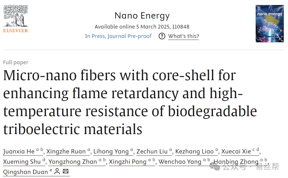 近日,广西大学王双飞院士团队段青山副教授联合资源环境与材料学院何娟霞老师在期刊《Nano Energy》上发表一篇题为“Micro-nano fibers with core-shell for enhancing flame retardancy and high-temperature resistance of biodegradable triboelectric materials”的文章。该项工作开发了一种具有核壳结构的聚乳酸(PLA)基阻燃摩擦电材料,实现了高温环境下稳定的自供电传感。该材料的双层氢键交联结构提高了阻燃壳层(聚乳酸/植酸钙,PLA/PA-Ca)和电性能增强核层(聚乳酸/羧基化碳纳米管,PLA/C-MWCNT)的分散性,使得阻燃和摩擦电性能增强。构建的单电极无线自供电报警系统通过可调的报警阈值实现了高温和火灾报警。