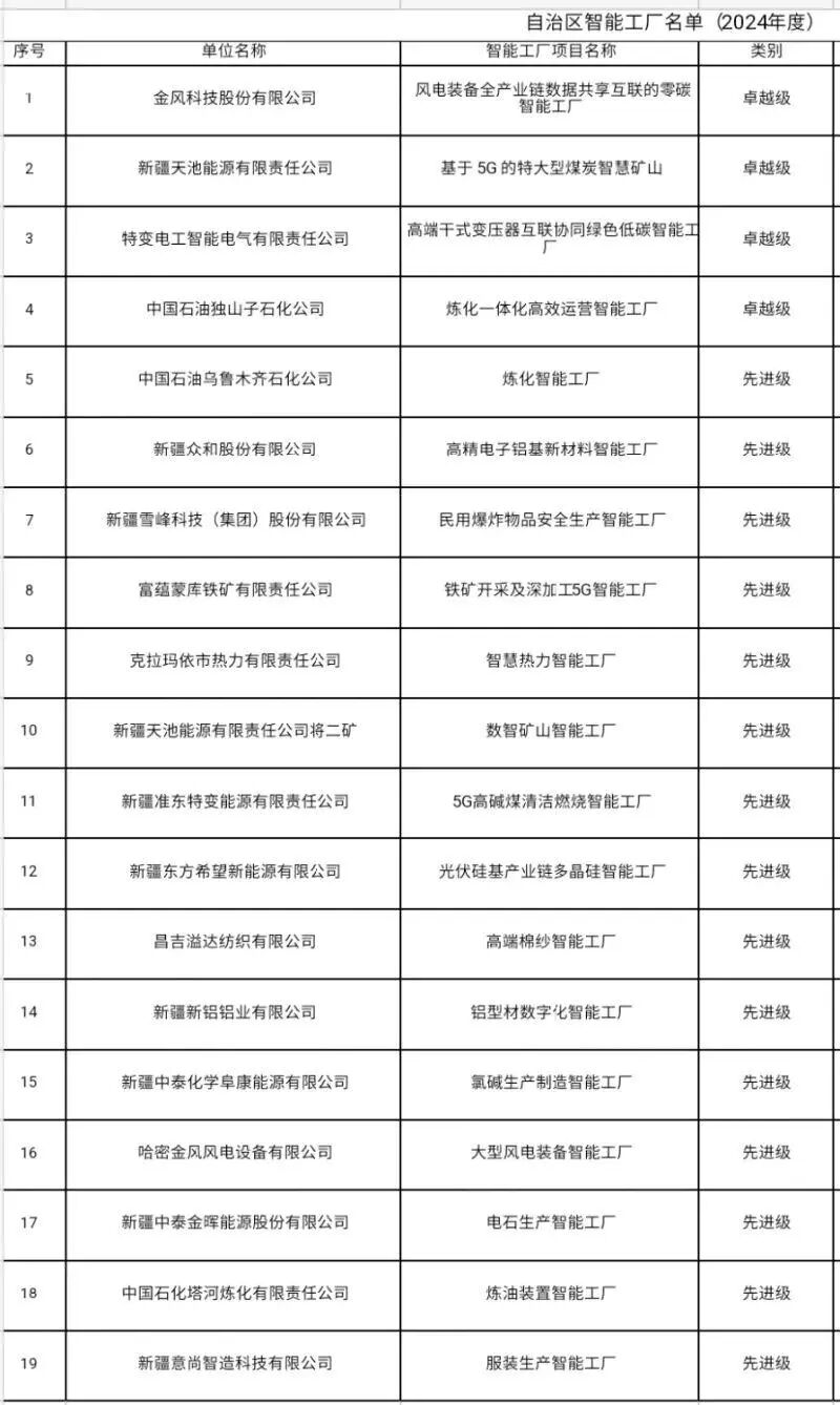 首批授牌的新疆智能制造优秀企业为4家卓越级智能工厂、15家先进级智能工厂。这些企业提质增效降碳成效显著,代表了我区制造企业智能化升级的领先水平。