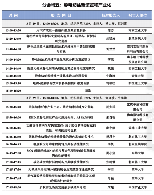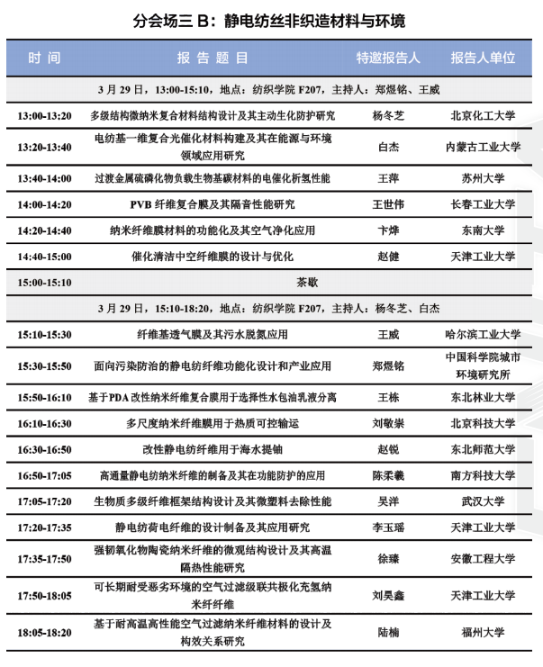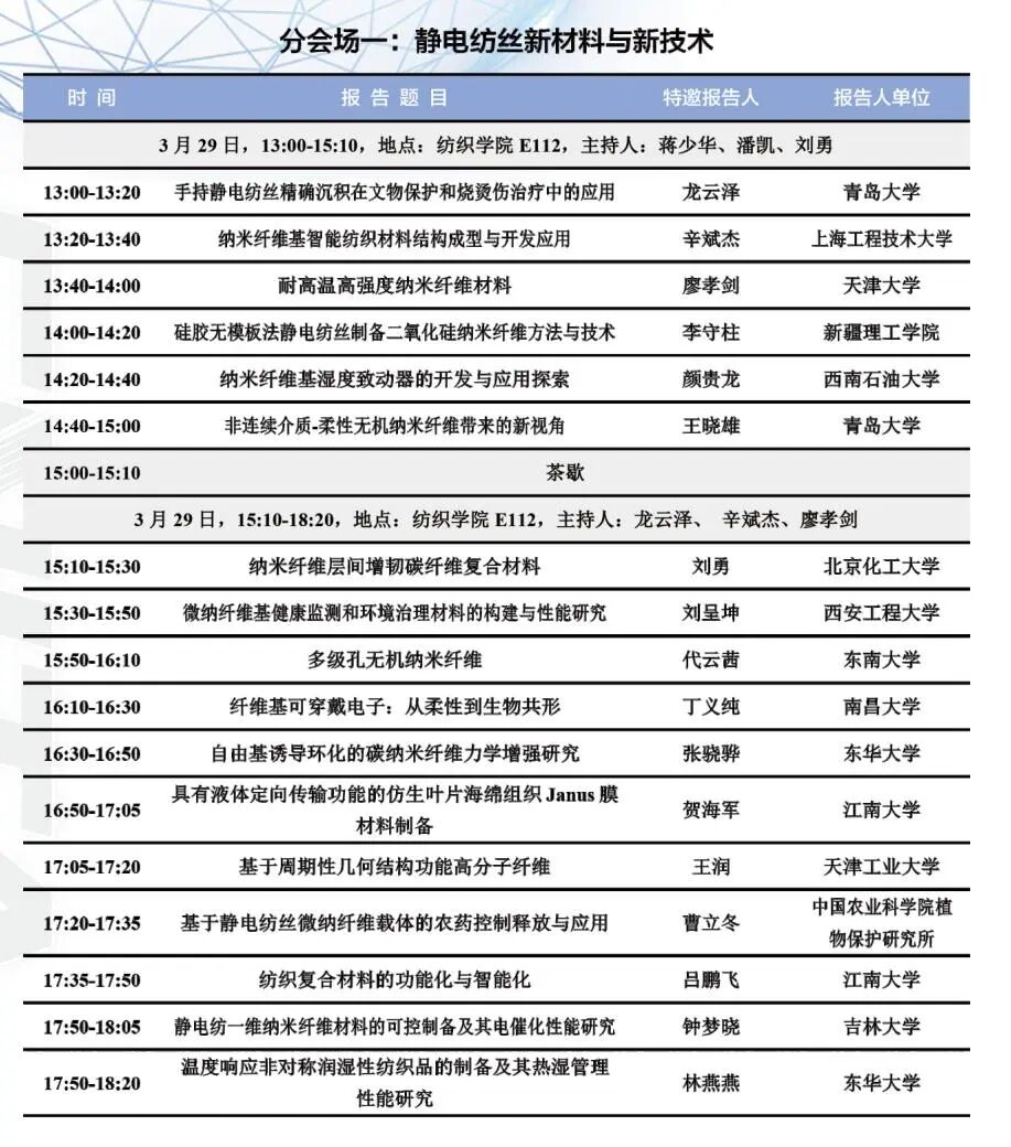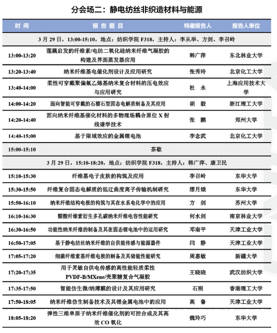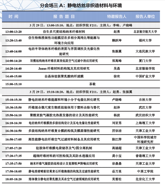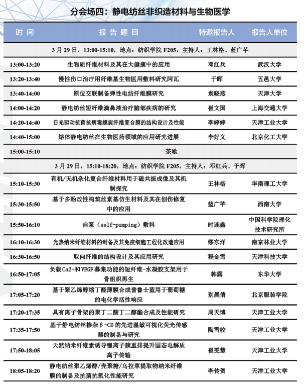 大会开幕式、特邀报告、闭幕式分别由天津工业大学纺织科学与工程学院常务副院长刘雍,江西师范大学教授侯豪情,清华大学教授、国家杰青张莹莹,天津科技大学教授程博闻,北京化工大学教授杨卫民,东华大学纺织学院副院长王先锋主持。