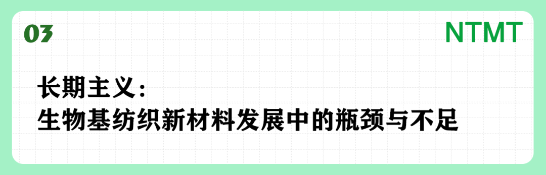 尽管市场一片蓝海,但需要指出的是任何一种新材料的问世必然会迎来各种各样的挑战与考验。当前阶段,我国生物基纺织材料的发展仍处于起步阶段,在技术、设备、基础研究等方面与国外存在一定差距,尚未形成良性供应链体系。其中生物基纤维生产成本高、性能有待提升,生物基皮革、蛛丝蛋白等生物基材料产量有限,产品市场竞争力弱,制约着产业的良性发展。