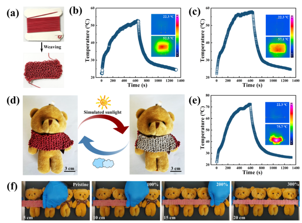 为了更直观地探究光热变色纤维在防寒保暖中的应用,研究团队将其织造成光热变色弹性织物作为可穿戴加热器穿戴在小熊身上。在 600 W m -2 的模拟太阳光下辐照 600 s ,小熊身上的光热变色弹性织物呈现显著的光热转换性能,平衡温度达 75.7 ℃ (环境温度, 22.3 ℃ ),最大温升为 53.4 ℃ 同时,光热变色弹性织物依然保持灵敏且高光学对比度的可逆变色性能;光热变色弹性织物维持良好的可拉伸性能,伸长率可达 300% 揭示了通过湿法纺丝法制备光热变色纤维的可行性,以及光热变色弹性织物在温度可视化纺织品和可穿戴加热器等领域的应用。